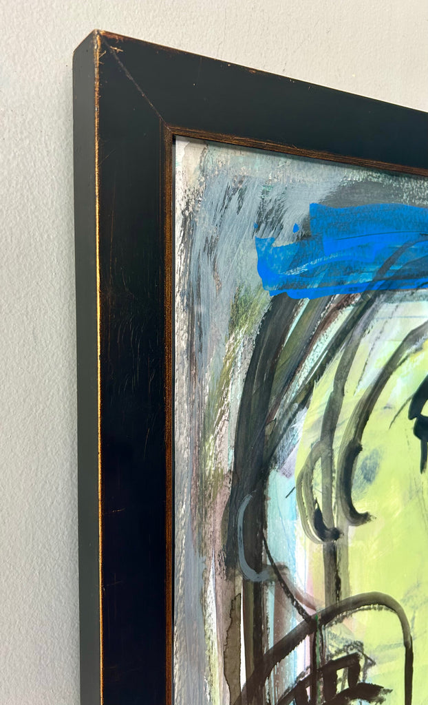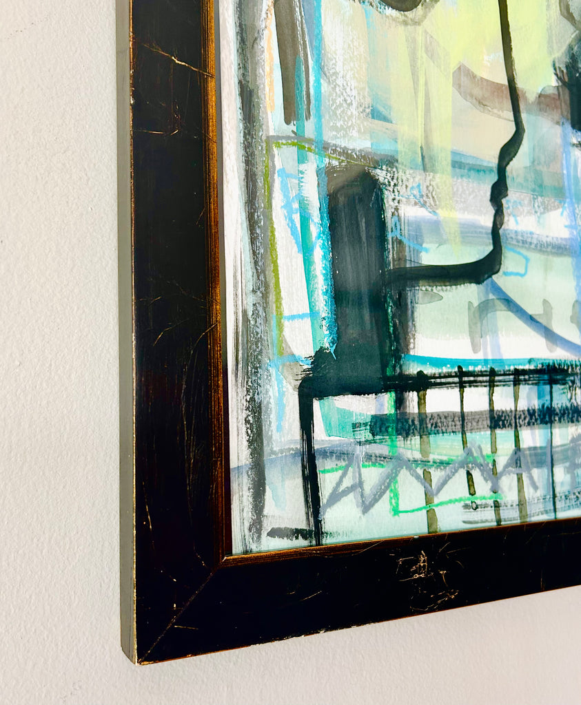 watercolor and oil pastel on paper, framed in wooden frame with glass