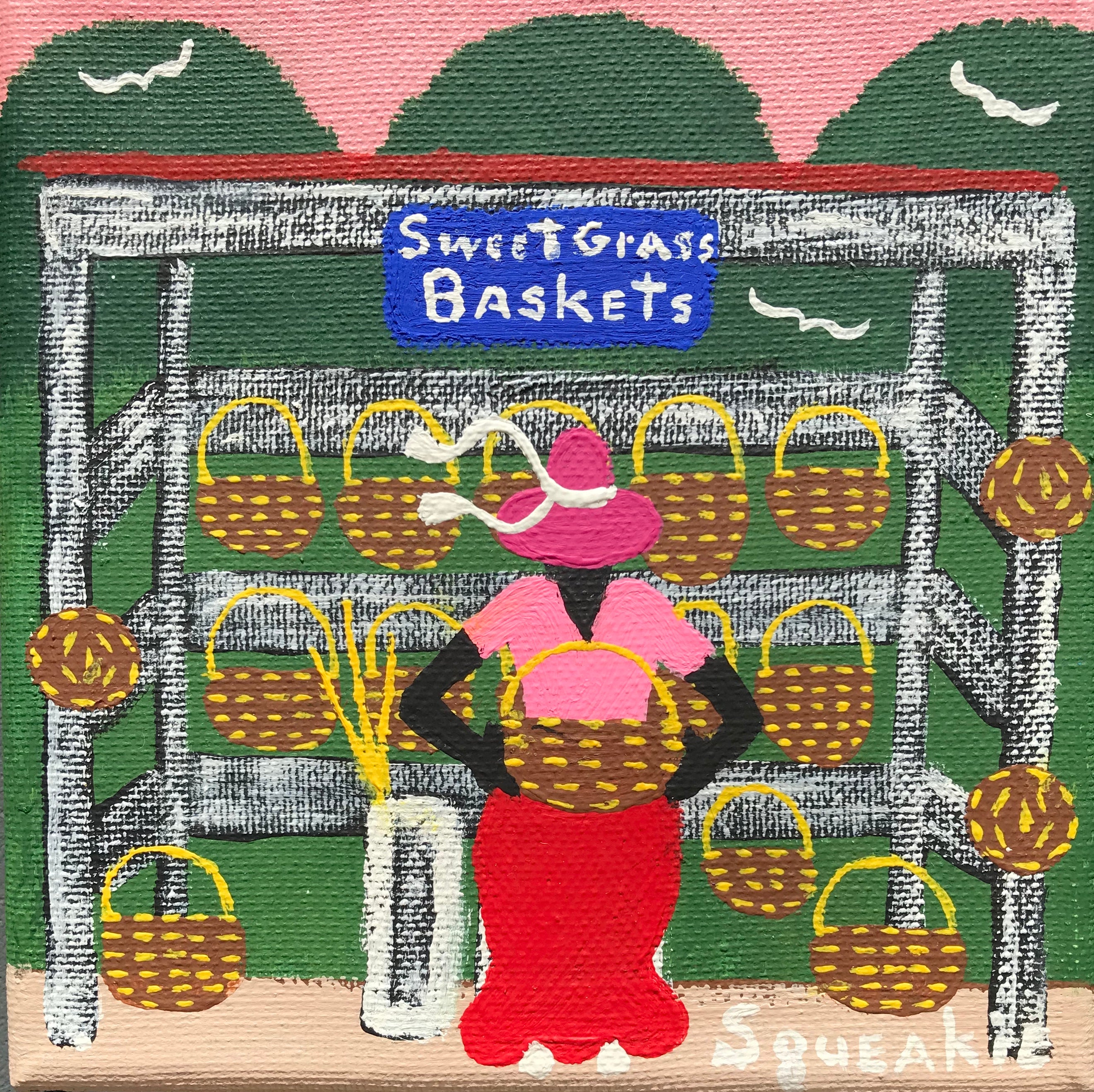 Squeakie is a self-taught artist from the rural Lowcountry whose nostalgic paintings portray a simpler way of life in Coastal South Carolina. He draws his inspiration from memories of childhood where he often worked in tobacco and cotton fields. He talks about this time in his life as "the work was hard, but life was slower, more simple- not so many distractions and bills to pay." He went on to work in factories and grocery stores until he became a house painter for nearly 25 years. Like many self-taught artists, Squeakie did not start creatively painting until later in his life. He was encouraged to do so by his Uncle Henry "Squirrel" Stone, who was a folk artist himself. One of Squirrel's clients asked for a commissioned painting of a church. Squirrel passed this commission on to Squeakie. Since that first painting, Squeakie has a resolute sense of purpose in his work. In 2007 he became a full-time artist, and now his "naive, down-home pictures" have been bought by collectors across the United States, and abroad. He says he paints more now than when he painted houses as his paintings tend to get snapped up quickly.