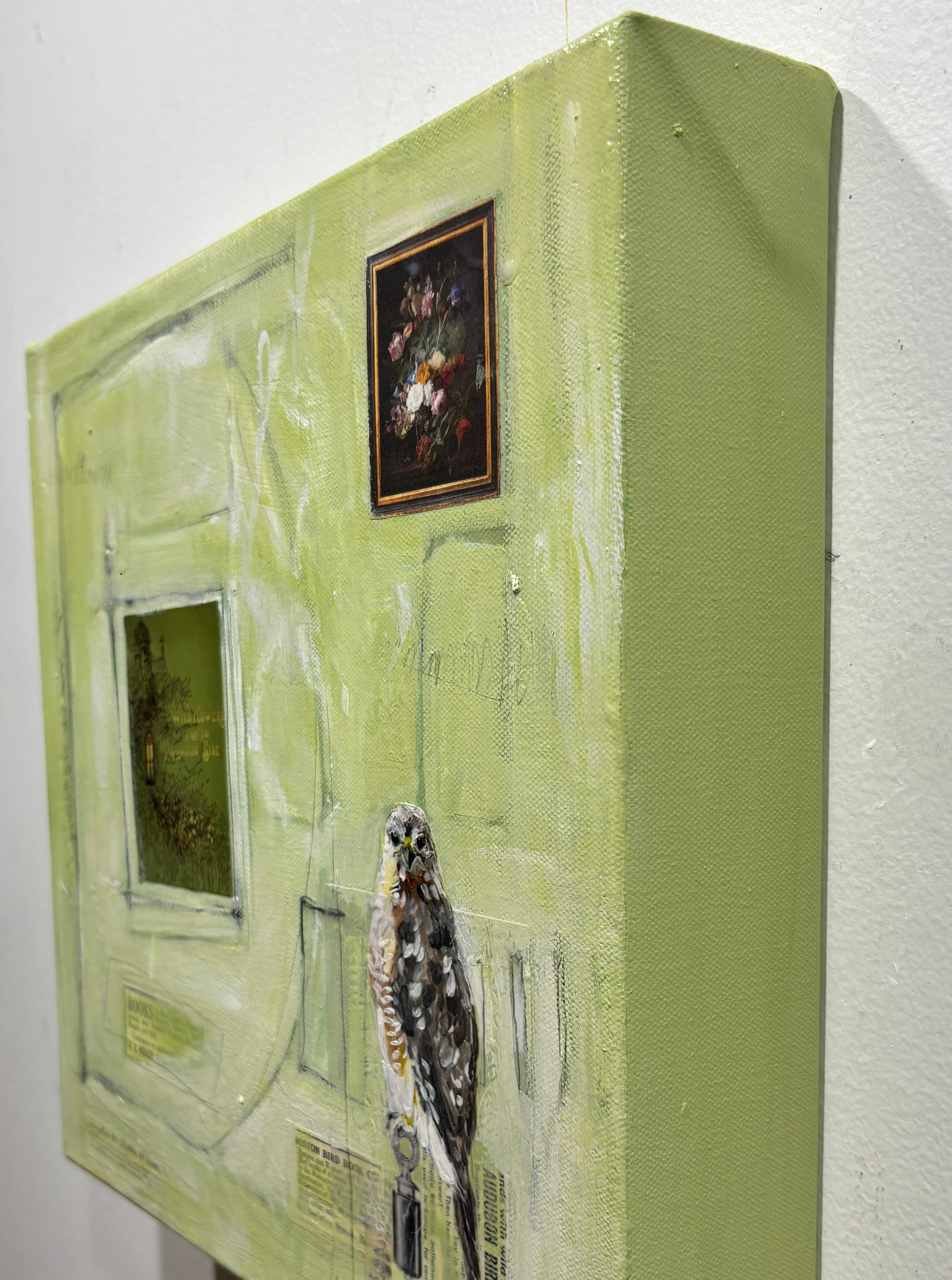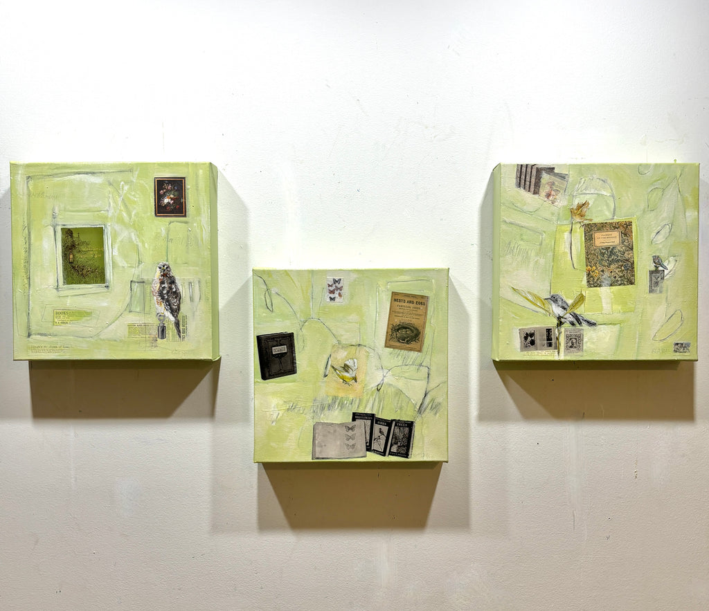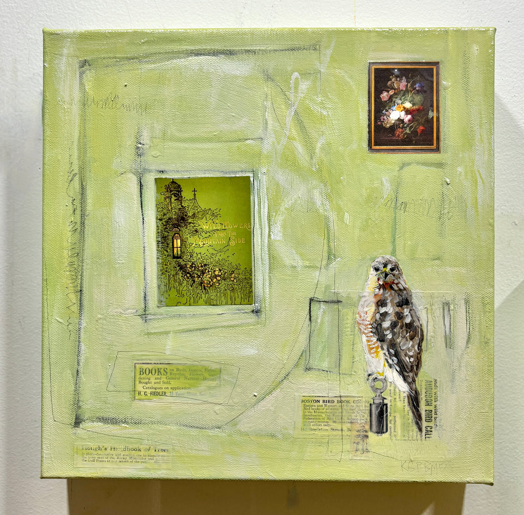 A lifelong artist, I make art because coming up with an idea is what gets me out of bed in the morning and into my studio, mercifully located in my home. So much of what I love in life is at home- my pets inside and wildlife out, nature pouring through the windows, comfortably cluttered rooms full of books and art, the forest surrounding me. My art originates with that early morning idea, a daily walk in the woods, the imagery around me. The deep connection to my surroundings is reflected in the art I make, even using pages of books in my art and the book itself as the canvas with the animals love as the subject. Animal and landscape renderings in mixed media, storytelling dioramas and large works on canvas all have a similar feel of natural wonder.