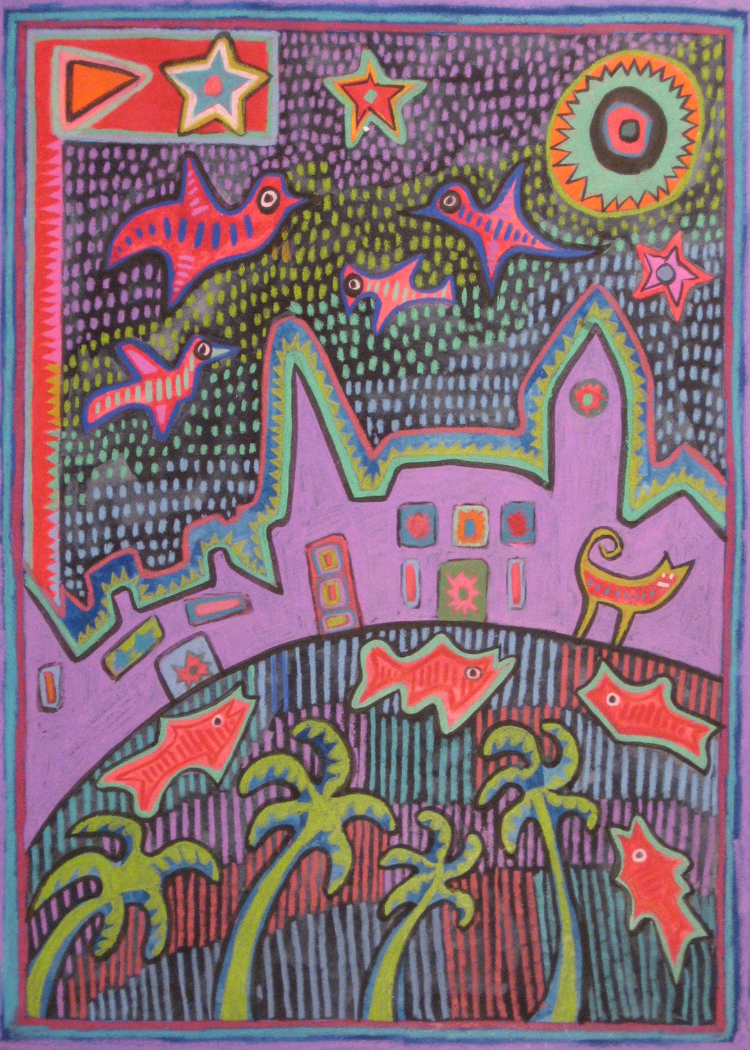 Linda Elksnin's inspiration comes from textiles, outsider artists, and mainstream artists such as Mark Rothko, Romare Bearden, and Marc Chagall. She enjoys incorporating symbols, shapes, and subject matter from a variety of cultures, including those of the American South, Appalachia, and Haiti, as well as the aboriginal people of Panama and Australia. Linda uses a variety of media (acrylic, watercolor, gouache, color pencil, pastel) and works on paper, canvas, and wood. Whether abstract or loosely based on reality, the common thread of all her work is color and graphically pleasing design. Her work is often described as whimsical and happy. Linda's passion for art began in elementary school when she took classes at the Philadelphia College of Art. Shortly after earning a BFA from Syracuse University, her career path took a different turn when she taught art to children with disabilities. After earning master's and doctoral degrees in special education from the University of Virginia, Elksnin came to The Citadel to coordinate the Graduate Special Education Program. She retired as Professor Emerita in 2006 and returned to painting full time. Elksnin's work has been shown throughout the southeast in galleries and at juried art shows. She was the Piccolo Spoleto Poster Artist in 2012 and the North Charleston Arts Festival Design winner in 2013. Linda works out of her Mount Pleasant Studio and at REDUX where she enjoys figure drawing and screen printing.