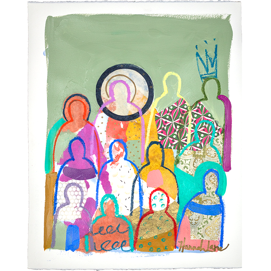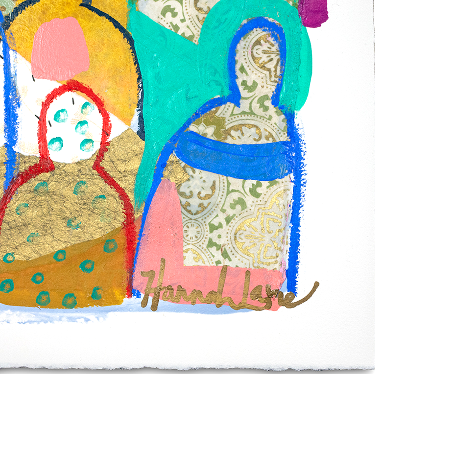 Hannah Lane is a contemporary mixed media artist celebrated for her bold use of color and dynamic, collage-like layering. A Louisiana native and graduate of the Savannah College of Art & Design, Hannah draws deep inspiration from the vibrant landscapes, diverse cultures, and heartfelt sense of family and community found in her southern roots. Her work blends pigmented Japanese papers, expressive line work, and rich washes of acrylic paint to create textured, energetic paintings. Each collection reflects her love for nature, storytelling, and community—an invitation to explore the beauty of her inner imagination. Hannah is represented by some of the top galleries in the Southeast, and her paintings are collected privately and in corporate spaces across the country. She also loves working one-on-one with collectors to create meaningful, custom pieces. After living and painting in Italy and New Orleans, Hannah now calls Nashville home, where she is part of a thriving art community. When she’s not painting in her home studio, you’ll find Hannah hiking with her boys, reading, or cooking up something seasonal and delicious! The crowd series is one of my most iconic collections, inspired by my big, beautiful Louisiana family and the joyful spirit of southern gatherings. I grew up surrounded by cousins, friends, and neighbors—many from families as large and lively as my own—where faith and family were at the heart of everything. Over the past 12 years, this series has evolved with new patterns, papers, and symbols that reflect the changing seasons of life. Each crowd painting is a kind of meditation, a reflection on the deep truth that we’re all connected. Rich with personal symbols and intuitive mark-making, these pieces push the boundaries of mixed media and invite you to see something familiar in a new way. Whether you're drawn to the vibrant energy, the quiet details, or the sense of belonging they evoke, each crowd carries its own unique aura—waiting for the right person to bring it home.