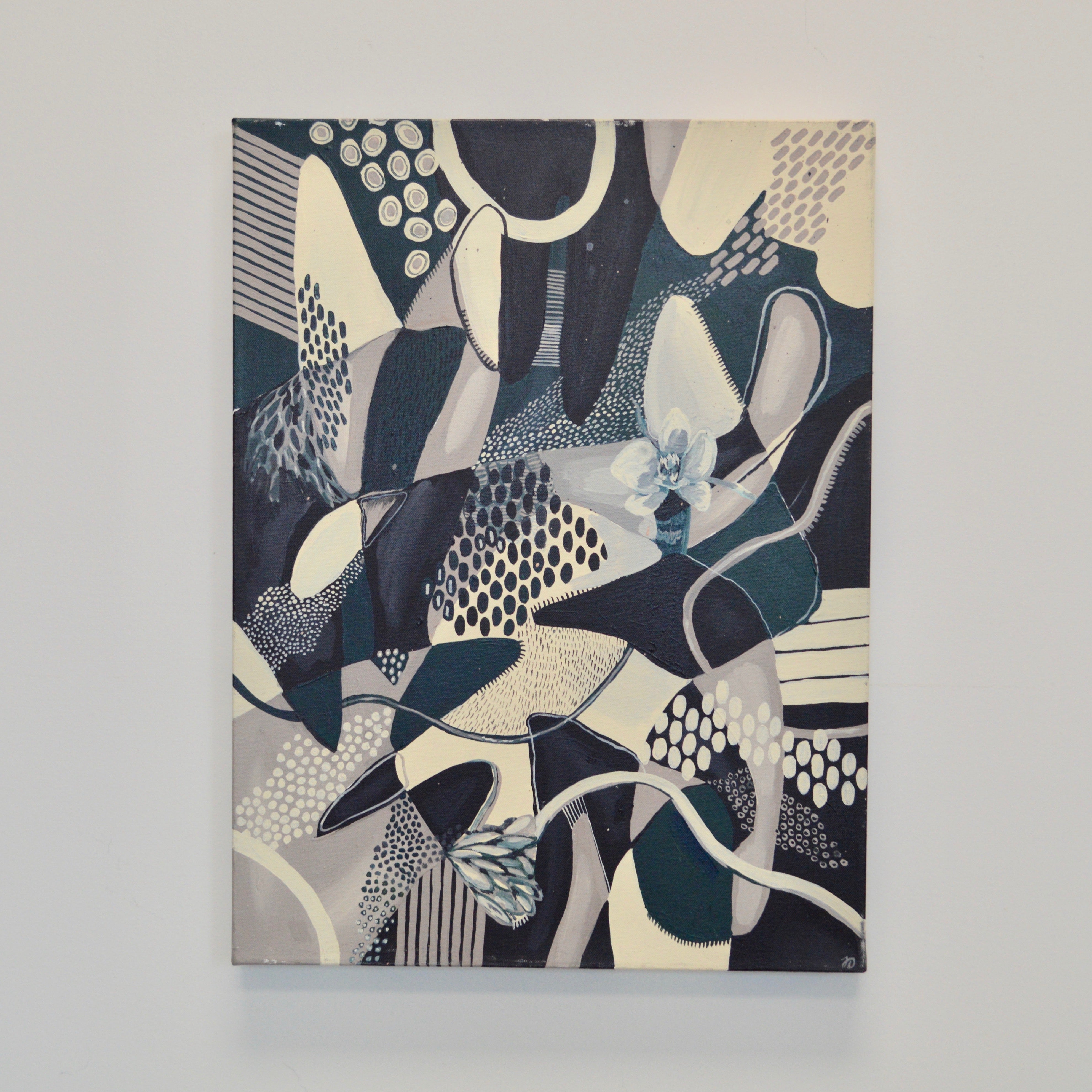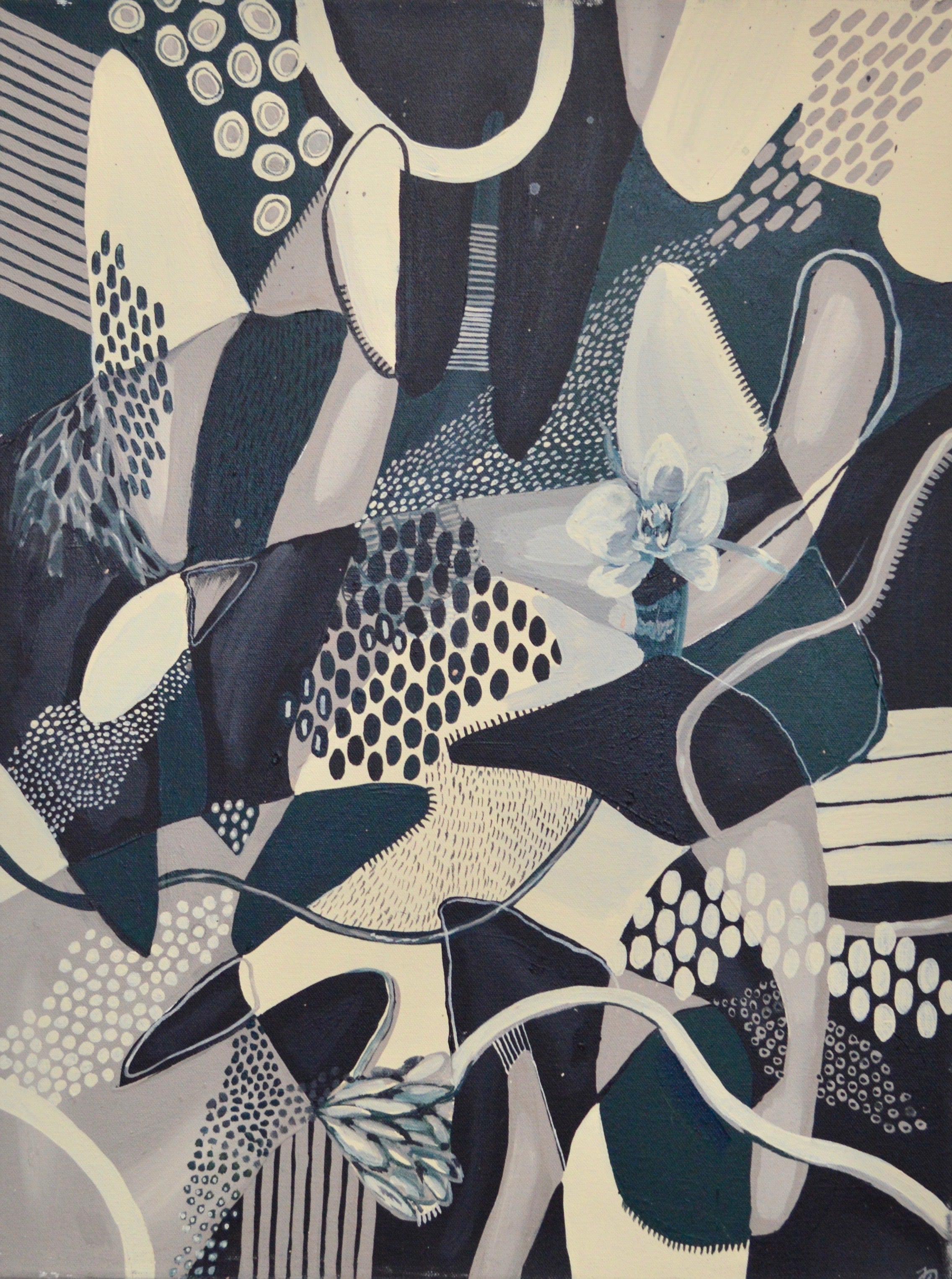 Tess Davies is an artist from Nashville, TN. She graduated cum laude from Sewanee: The University of the South with a B.F.A under the honors program in 2014. Her studio practices include murals, acrylic and oil painting, with a focus on natural textures, layered spaces and dualities. She takes inspiration from escapism and natural and biological textures and forms. "My work explores dualities. It restructures familiar, natural objects into a composition of disparate parts. It combines intricate details found in natural textures, fluidity, and chaos. Stillness and movement, color and contrast, and structure and looseness are all prevalent dualities in my work. The purpose of my practice is to address various inevitabilities in life. I am inspired by escapism and utilize this coping mechanism in my work. I use natural symbolism and feminine tropes, seen in the color palette and various natural forms. Common themes include decay, disease, growth, genetics, femininity, and repetition. I draw on personal issues and anxieties that bring people together, while simultaneously causing divides. I address what separates and connects us, and the cyclical nature of life and human tendencies. The painted, abstract beings represent our tendencies to compartmentalize and reveal personal anxieties. They transition in and out of abstractions and natural forms. This movement between the real and the imagined is representational of escapism. Creating these patterns, and repeating them intricately and deliberately, directly correlates to our repeated tendencies. It is also representative of the constant division of cells and growth found in the processes of decay and rebirth. By using natural metaphors, the purpose of this work is to beautify the inevitable."